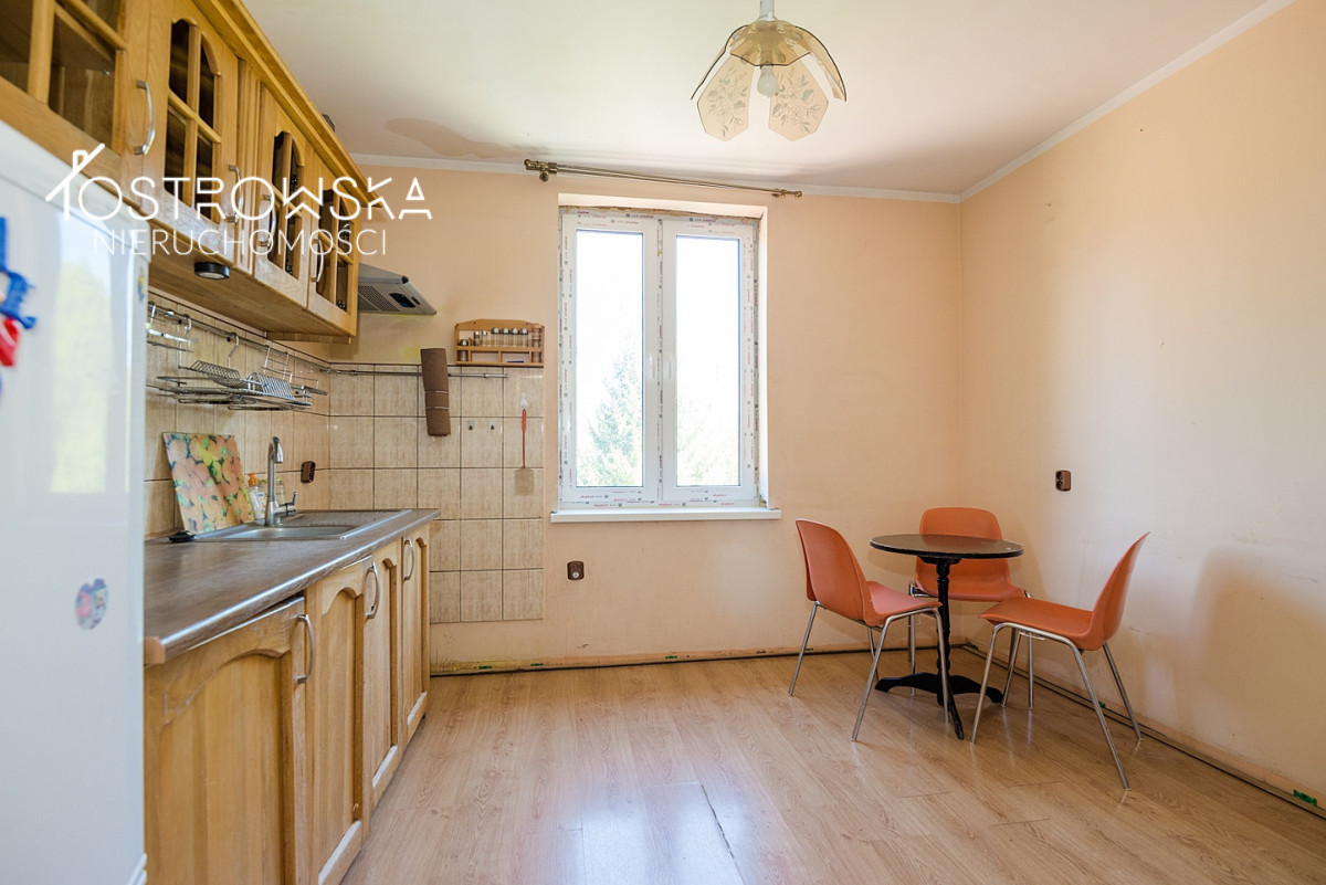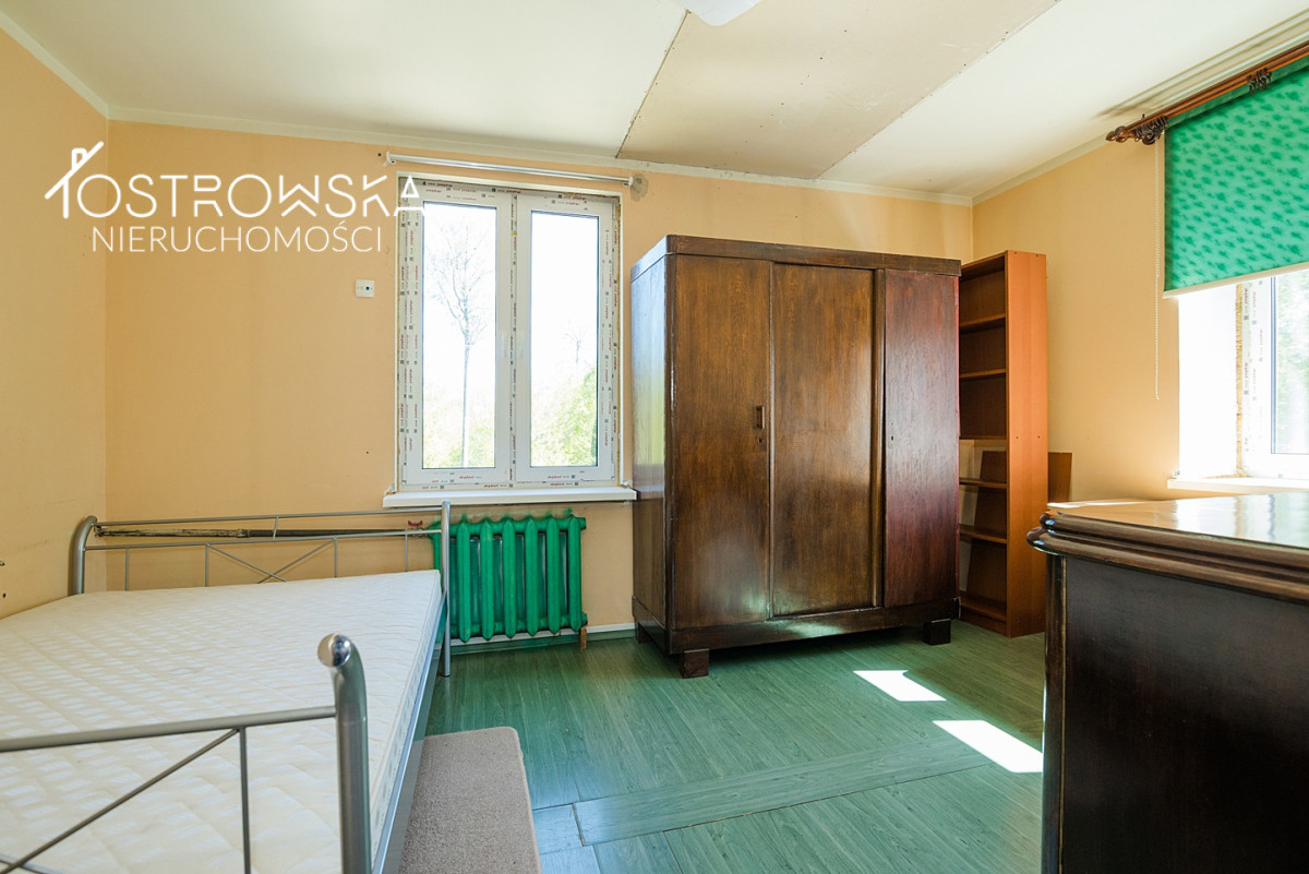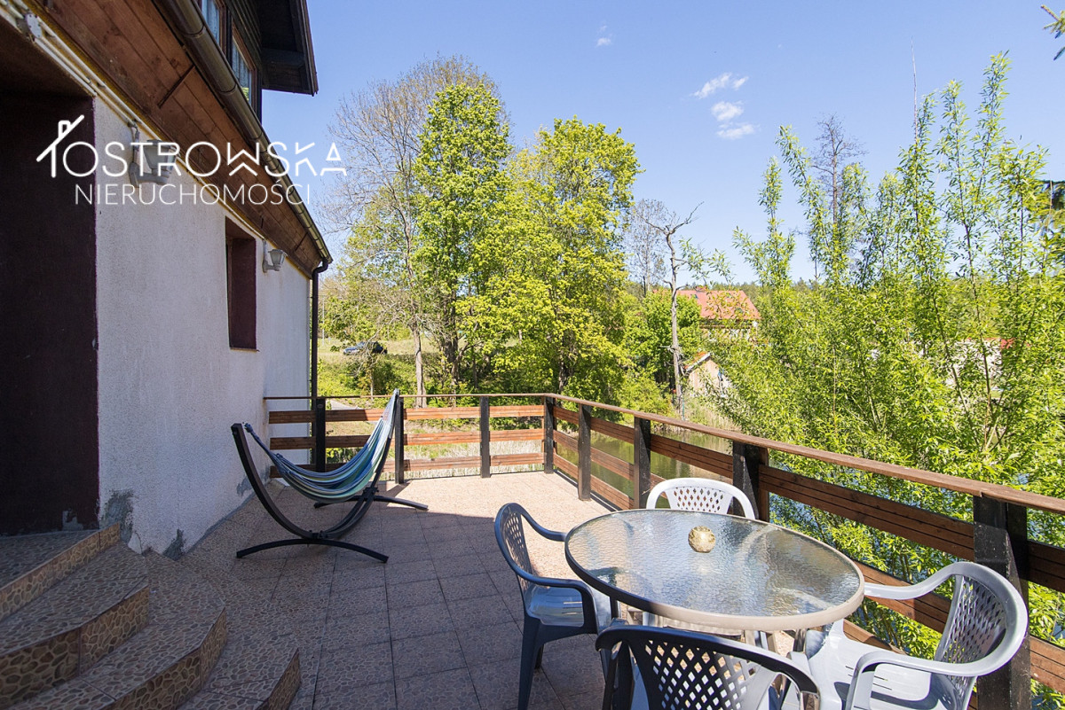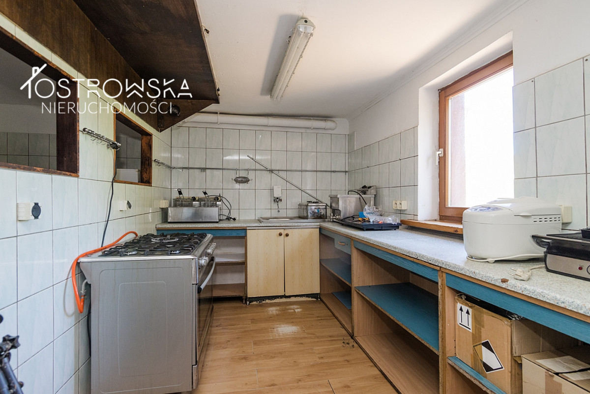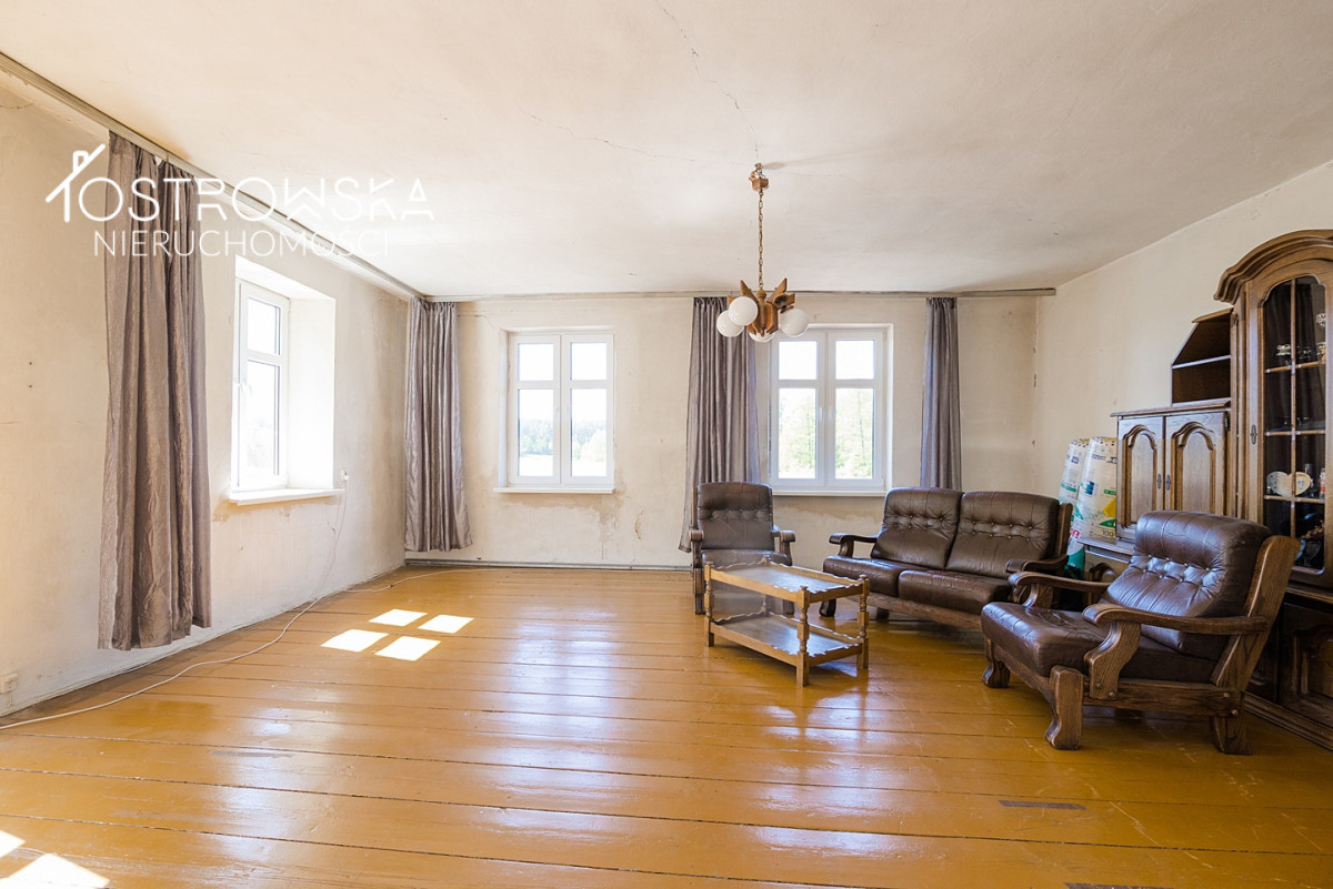 - część ogrodowa z paleniskiem na grilla, placem zabaw dla dzieci i zadaszoną drewnianą wiatą.Budynek 4 kondygnacyjny o pow. całkowitej ok 1000 m2 posiada bezpośredni dostęp do drogi publicznej nr 58. Dach nad częścią mieszkalną z dachówki ceramicznej ( wymiana3 lata ), wymienione wszystkie okna, wnętrze do remontu i adaptacji w zależności od dalszego przeznaczenia . Fundament zbudowany z głazów, ściany z cegły palonej o grubości ok 35 cm.